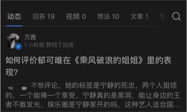 9 月 6 日凌晨,有網(wǎng)友發(fā)現(xiàn)萬茜在知乎上點(diǎn)贊寧靜和郁可唯的惡評(píng),隨后引發(fā)熱議。事件發(fā)酵后,萬茜在幾小時(shí)后取消了點(diǎn)贊。