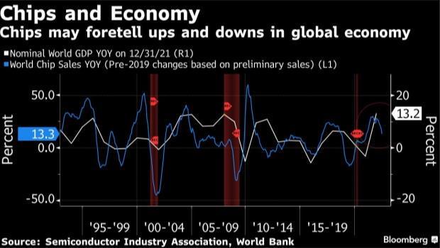 芯片銷售之所以開始降溫,是因為各國央行開始爭相加息以對抗螺旋式上升的通脹。彭博經(jīng)濟(Bloomberg Economics)進行的一項全球跟蹤顯示,今年世界經(jīng)濟前景迅速惡化,芯片銷售也隨之放緩。